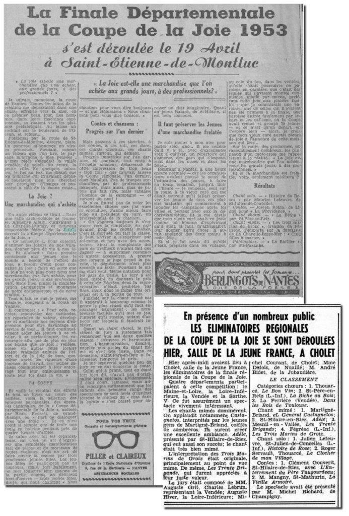 Dans son mémoire, Gwenaelle LAOT[5] décrit ce qu’étaient les « coupes de la joie au village » : « La coupe de la joie existe à plusieurs échelons et prend la forme d’un concours avec sélection des meilleurs numéros à chaque échelon [sketches, danses, concours de chant, et autres expressions artistiques]. Quand il y a de nombreux candidats, des éliminatoires sont prévues dans chaque commune à l’occasion d’une veillée, d’une séance théâtrale ou d’une séance spéciale. Aux échelons de base comme la commune ou la section, ce sont les militants et animateurs locaux qui prennent la coupe en charge. Les meilleurs numéros sont retenus pour la finale du secteur (l’équivalent du canton). Lors du festival de zone (l’équivalent de l’arrondissement), le matin est consacré à une séance d’étude puis à une messe, l’après-midi étant réservé au Festival de la Joie. »