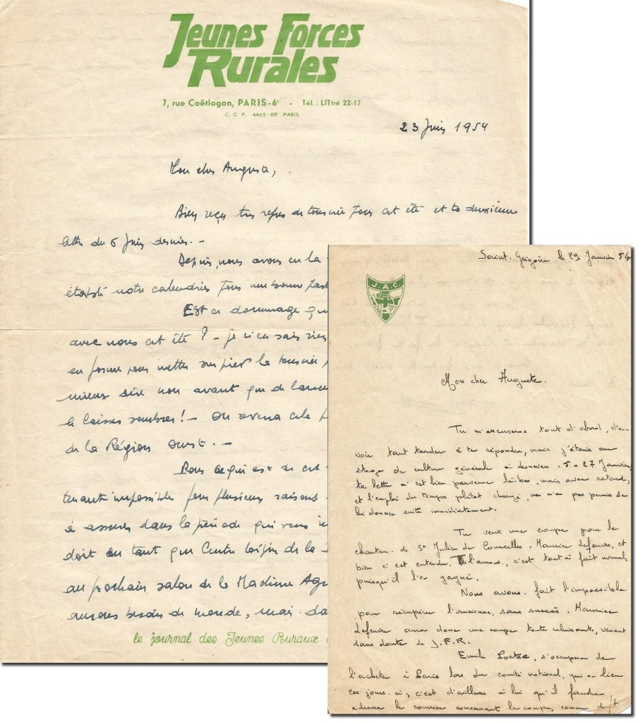 En janvier, Auguste est de retour sur l’exploitation de la Guilbaudière. Fini le temps du service militaire, dont le seul avantage selon ses dires a été de lire et de parfaire sa culture générale. Il choisit alors de s’engager pleinement dans la JAC (Jeunesse agricole catholique) et d’abord localement.