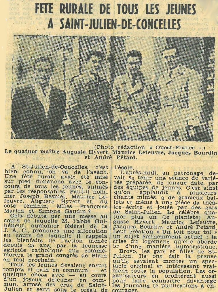 Dans le cadre de ces séances, à la fin de l’année 1952, Auguste HIVERT décide de monter un groupe de variétés appelé « les 4+1 » avec 4 autres jeunes de Saint-Julien-de-Concelles : Maurice LEFEUVRE, Jacques BOURDIN, André PÉTARD et Jean Clément PRÉAUDEAU.