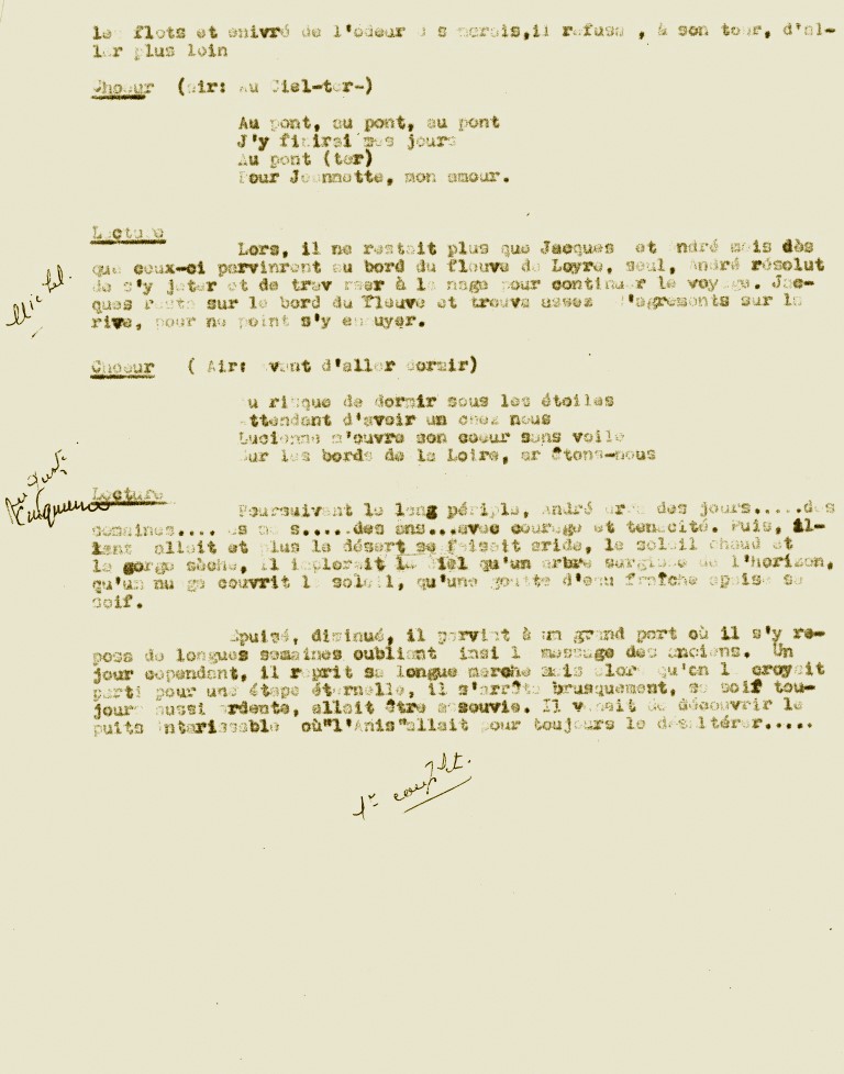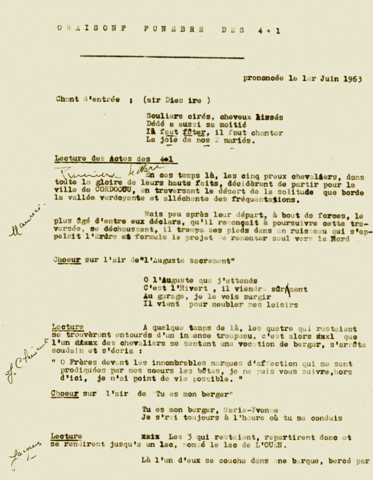 « Pourtant nous étions encore avides de représentations et d’animations, ajoute Jacques « sans doute un peu nostalgiques de la période des « 4+1 ». Je continuais de mon côté à jouer du violon. Maurice LEFEUVRE mais surtout Auguste HIVERT toujours au fait de l’actualité culturelle et musicale nous faisaient régulièrement part de leurs recherches au cas où la troupe se reformerait ».