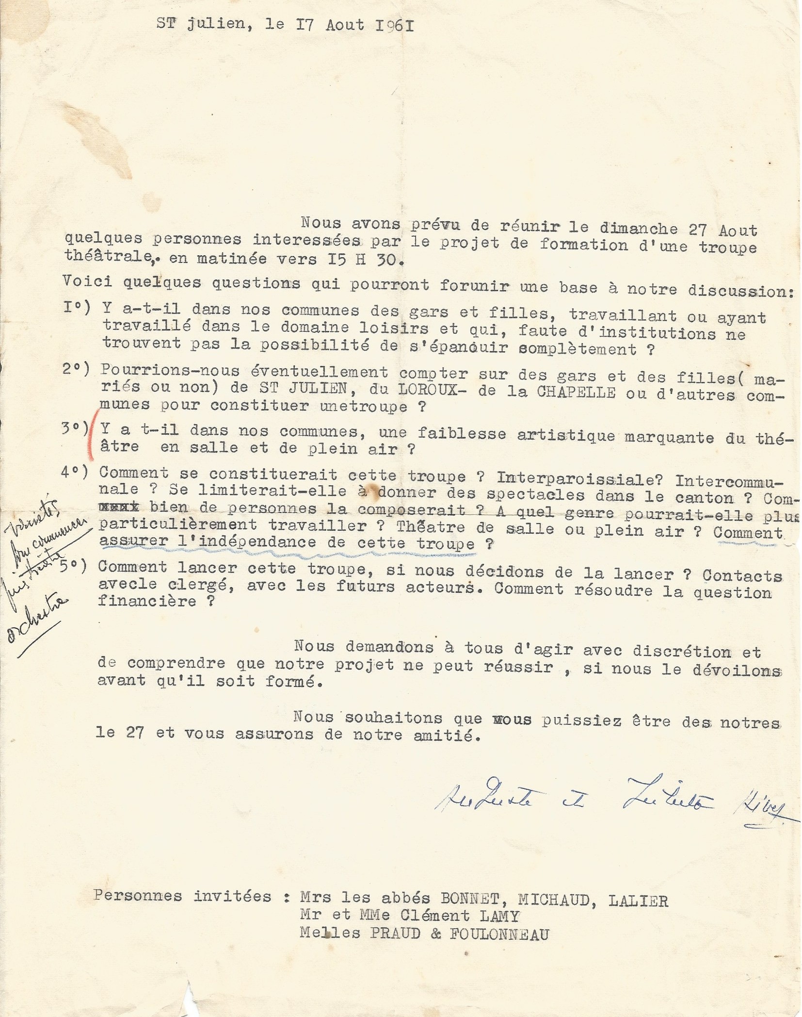 « Des initiatives ont été prises pour que la vie culturelle perdure », se souvient Jacques BOURDIN, l’un des membres de la troupe des 4+1 : « Gilles CUSSONNEAU a été à l’origine d’une troupe – Les ambassadeurs du sourire- qui n’a pas vécu très longtemps. Juliette et Auguste HIVERT ont souhaité lancé une compagnie théâtrale cantonale avec l’appui des vicaires de l’époque. Là encore leur initiative n’a pas été suivi d’effet ».