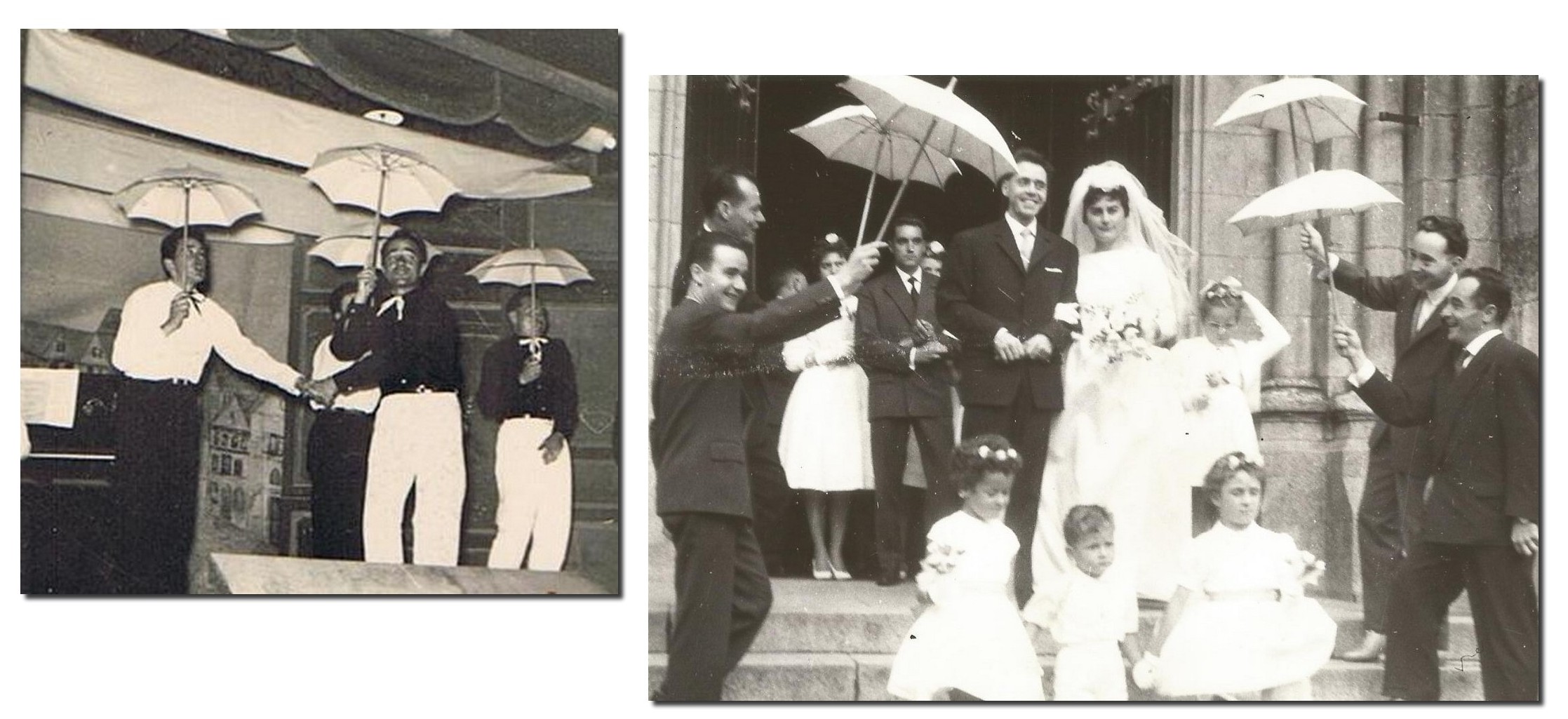 « En fait la troupe des 4 +1 ne s’est reconstituée qu’au moment des mariages des uns et des autres » ajoute Jacques, d’abord celui d’Auguste et Juliette (lien vers l’article du blog 1956 : l’album de mariage de Juliette et Auguste) puis celui de Maurice et Maryvonne en 1959 et de Jean-Clément et Jeannette, l’année suivante. La tradition voulait également qu’à la sortie de l’église on sorte aussi les parapluies de la chanson que nous chantions sur scène : « A la St Médard ».