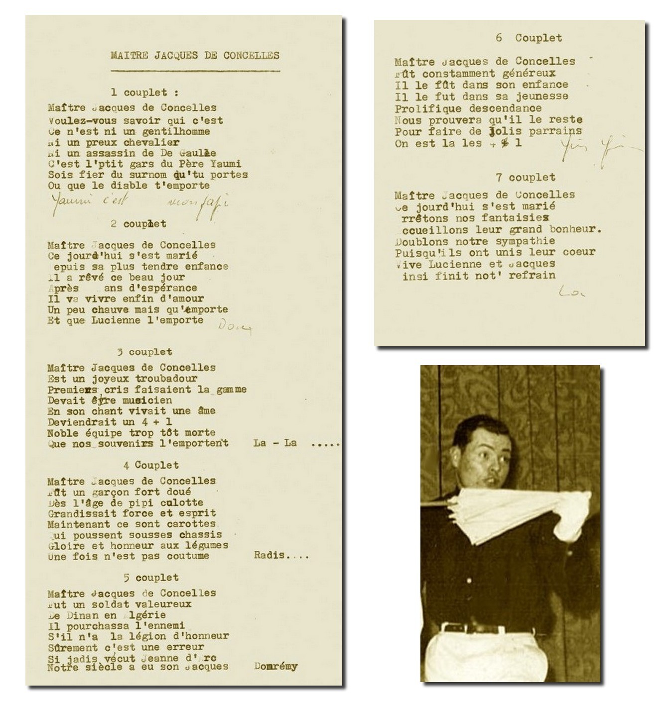 « Sur l’air de la chanson interprétée par les compagnons de la chanson « Maitre Jacques le notaire a cinq filles à marier », les 4 autres compères du groupe ont chanté une parodie de leur cru intitulée « Maitre Jacques de Concelles » ajoute Jacques.