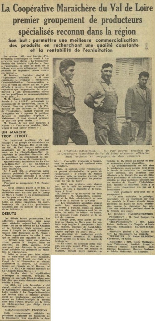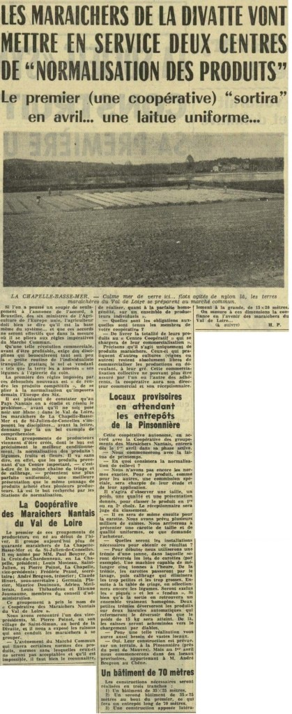 Très vite nous est venue l’idée de créer un outil de gestion commun de mise en marché de nos légumes. J’ai participé avec une cinquantaine de producteurs à une première réunion à la mairie de La Chapelle Basse-Mer à la fin de l’année 1961. La coopérative fut créée peu de temps après, le 1 mars 1962.