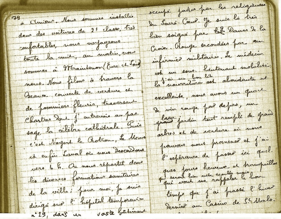 Au fil des jours, après avoir décrit les circonstances de sa blessure, Auguste affirme le 10 novembre qu’« il n’a jamais été aussi heureux matériellement de toute sa vie ». Le dimanche 15 novembre, jour de la fête belge, il raconte : « après la messe de 10h, nous allons au réfectoire, il est décoré de guirlandes tricolores et de drapeaux belges ainsi que des portraits du roi Albert et du maréchal Foch et du général Joffre. Voici le menu, vol au vent, volaille, confitures, vin rouge, pâtisseries, champagne, café, cigare … »