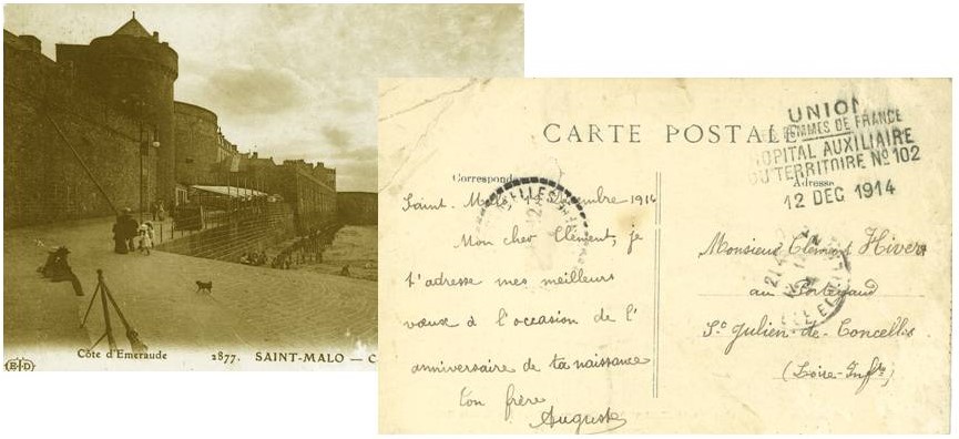 Auguste sera pris en charge par l’hôpital auxiliaire implanté au sein du Casino de cette même ville. De là il enverra à sa famille, ses parents Pierre et Clément presque une lettre par jour. De même Auguste et Marie, ses parents lui transmettront, un courrier tous les jours, Pierre et Clément feront de même mais moins régulièrement.