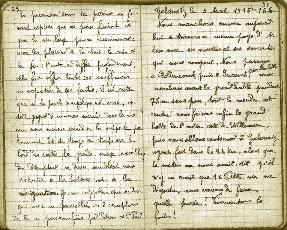 Le 6 avril sa compagnie quitte son cantonnement pour repartir dans une longue marche vers Galametz puis Bouquemaison qu’il atteint le 13 avril. L’épuisement l’invite néanmoins à méditer sur son sort.