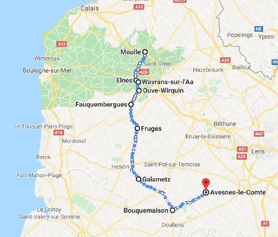 Marche d’exercice, puisque dès le lendemain il quitte brusquement Avesnes pour revenir sur ses pas et rejoindre Krumbeke au nord de Poperinge (Belgique) en autobus.