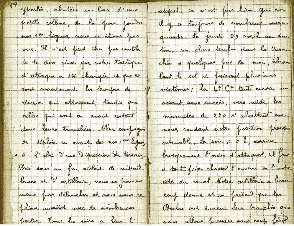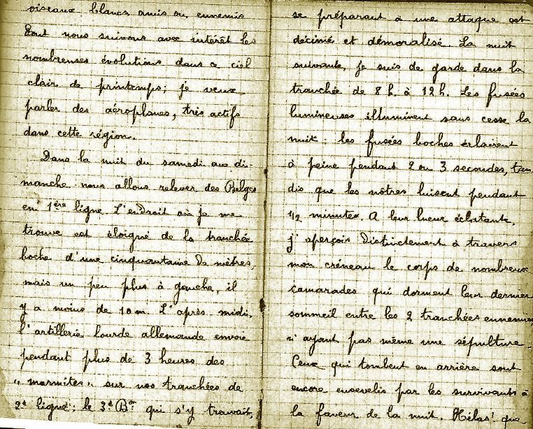 Il ne sait pas où il est conduit, mais le 26 avril il se trouve en tranchée de 2ème ligne afin de contrer une percée allemande près du ruisseau de l’Yperlée au nord d’Ypres en Belgique. Les combats sont terribles….