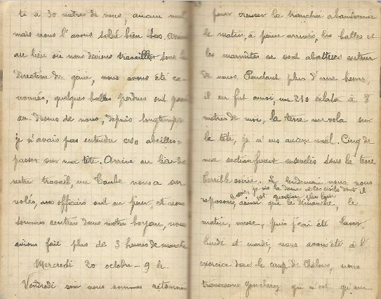 On y aménage des tranchées pendant que les avions se livrent bataille au dessus. « Les journées sont calmes » écrit-il, jusqu’au 10 octobre où balles et marmites s’abattent brutalement autour de lui. Cinq de ses camarades meurent ensevelis…