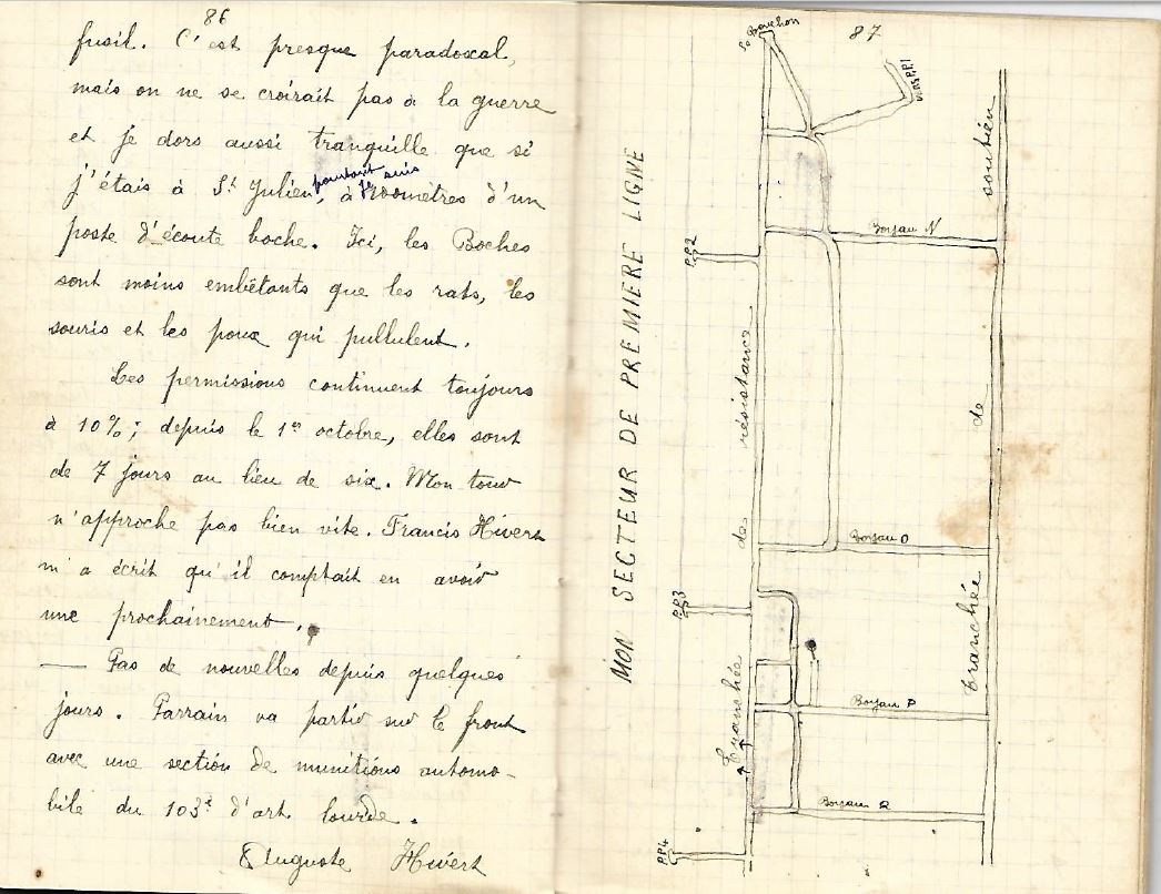 Il rejoint à pied la première ligne entre Tahure et l’Argonne près du village de Courtémont le jeudi 5 octobre au terme d’une marche de près de 80 km. Il fait beau, le secteur est calme et « mes journées se sont donc passées en dehors des courses et des repas, à dormir, à lire et à écrire ». Il en profite pour dessiner un plan de son secteur:
