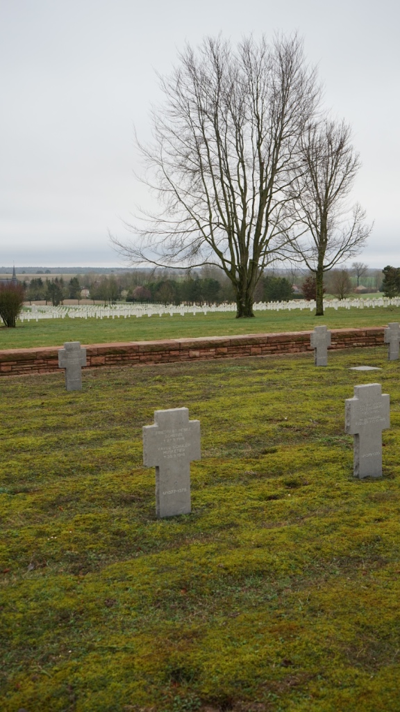Nous nous rendons sur place. Il ne reste que l’emplacement du bois. Nous allons ensuite au cimetière militaire de Crouée. Les croix allemandes de grès gris voisinent avec les croix blanches françaises.