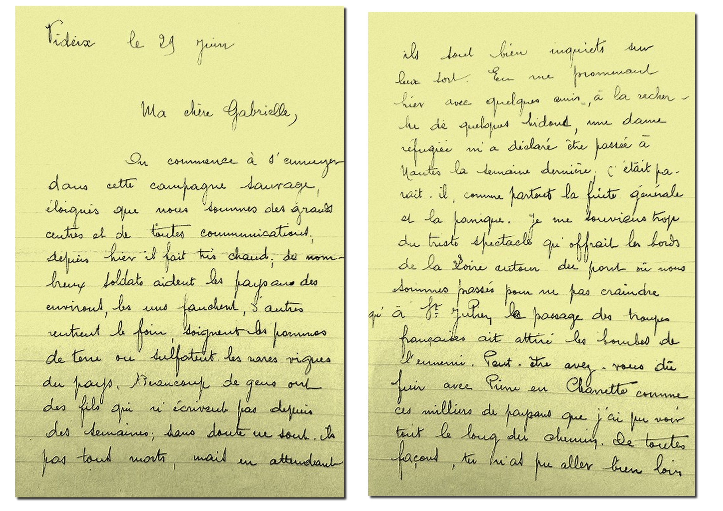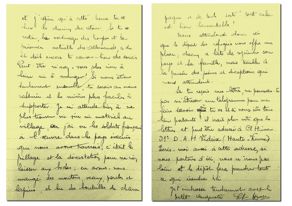 La signature de l’Armistice le 22 juin a donc stoppé la fuite. Alors qu’il s’attend à rejoindre Jonzac, il est stationné à Videix (Haute -Vienne) au lieu-dit La Chassagne. Il « commence à s’ennuyer dans cette campagne sauvage, éloignés que nous sommes des grands centres et de toutes communications ». Dans sa lettre du 29 juin 1940, il est très inquiet pour les siens car il a appris que les allemands étaient à Nantes.