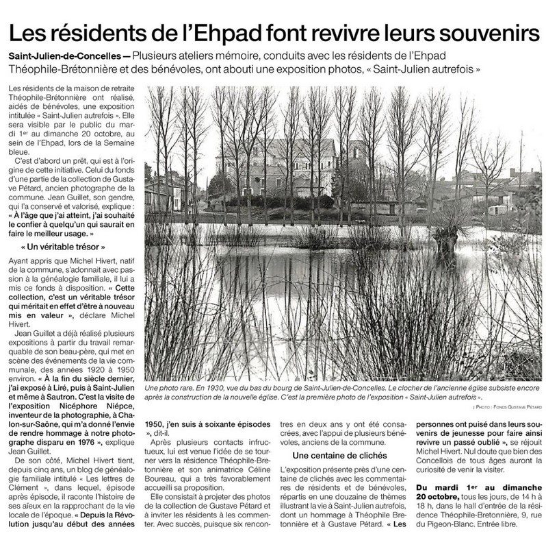 C’est l’aboutissement de six ateliers-mémoire qui se sont déroulés d’octobre 2022 à février de cette année. Ils ont associé à chaque fois une vingtaine de résidents et quelques bénévoles qui connaissent bien l’histoire de la commune. Lors de ces séances, nous avons projeté des dizaines de photos, principalement issues du fonds Gustave Pétard, ancien photographe de Saint Julien. Les personnes présentes ont pu alors puiser dans leurs souvenirs de jeunesse pour les commenter. Cette exposition est le fruit de ces rencontres et fait revivre un passé un peu oublié.