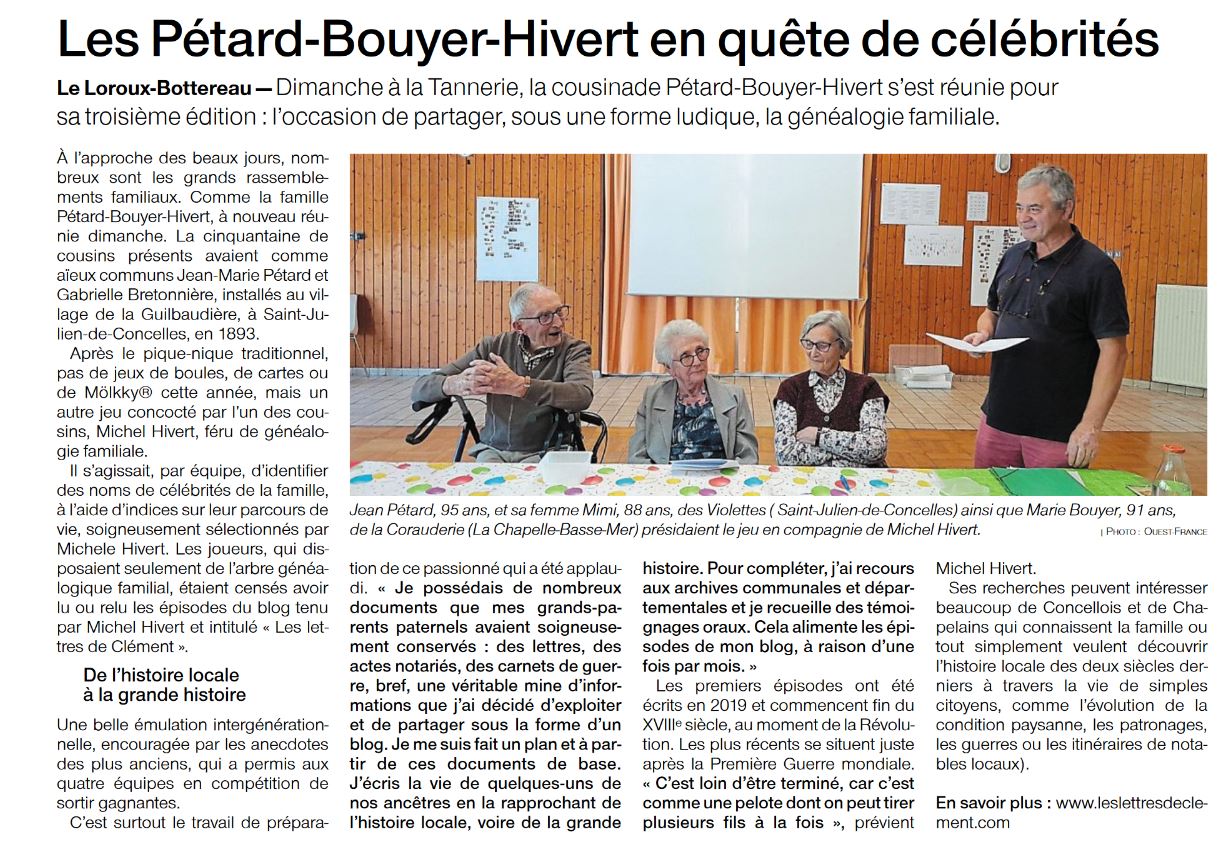 Cousinade Pétard 2022 Article de presse et quelques photos de la cousinade du dimanche 5 juin 2022 autour du jeu de la généalogie familiale. Ouest-France du mercredi 8 juin 2022 Partager : Partager sur X(ouvre dans une nouvelle fenêtre) X Partager sur Facebook(ouvre dans une nouvelle fenêtre) Facebook J’aime chargement…